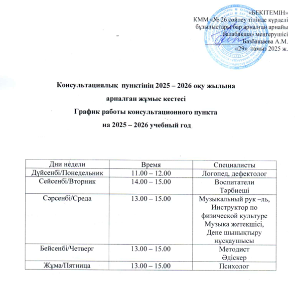 Мектепке дейінгі тәрбие мен қамтылмаған балалардың ата-аналарына арналған консульсультациялық пунктінің жұмыс жоспары.